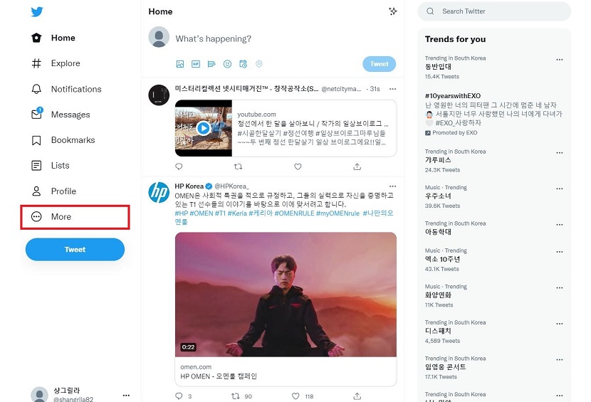 1. 트위터 페이지 왼쪽 하단의 점 3개 More 버튼을 눌러주세요.