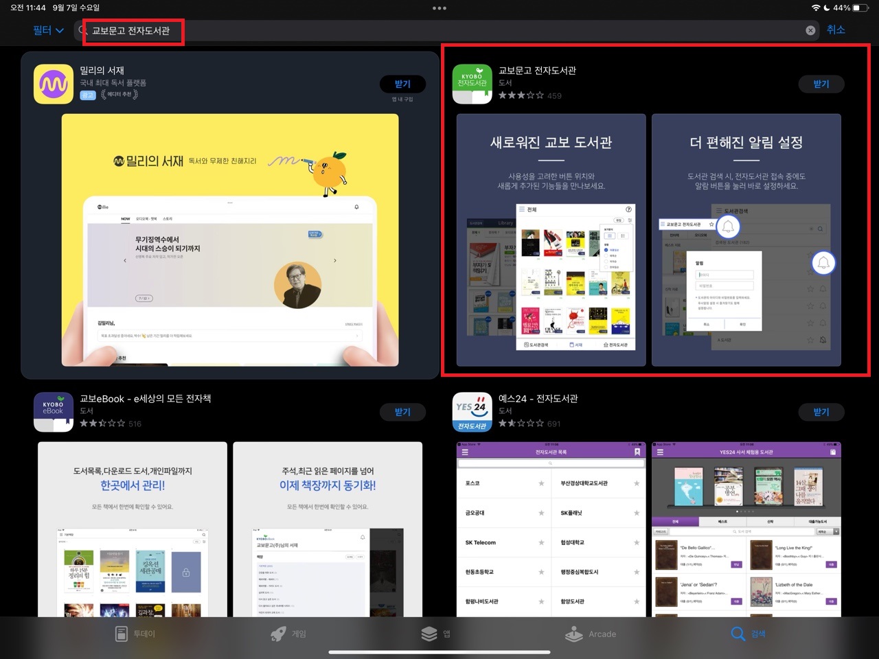 1. 앱스토어나 구글플레이스토어에서 "교보문고 전자도서관" 을 검색하고 어플리케이션을 다운
