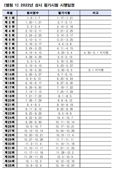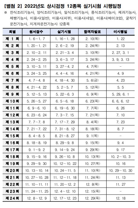 양식조리기능사의 경우 상시 시험으로 진행되기 때문에 매달 시험이 있으며, 2022년도 상시 필기시험 시행 일정은 아래의 표를 참고하시면 되겠습니다.